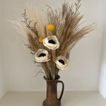Verleihe Deinem Zuhause einen Hauch von rustikalem Charme mit dem Trockenblumenstrauß Feldzauber. Perfekt für Deko- und Naturliebhaber sowie für alle, die den Boho-Stil lieben. Dieser exquisite Strauß verbindet die sanfte Eleganz von weißem Mohn und das natürliche Flair von Weizen mit der verspielten Textur des Lagurus, auch bekannt als Hasenschwanzgras. Mini-Fluffy-Pampasgras und das weiße Miscanthus/Federgras verleihen dem Arrangement eine luftige Anmutung, während natürliches Pampasgras und gelbes Liebesgras sonnige Akzente setzen. Ob als Mittelpunkt auf einem Esstisch oder als zarter Blickfang in einer Leseecke – der Trockenblumenstrauß Feldzauber bringt die Schönheit der Natur direkt in Dein Wohnzimmer. Erlebe die zeitlose Eleganz der Trockenblumen, die pflegeleicht und langlebig Deinen Raum veredeln.